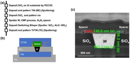 Figure 1 shows the fabrication process flow, schematic of the device structure, and transmission electron microscopy (TEM) image (cross-section) of the RRAM device, respectively. The heavily-doped N+ Si wafers are as the starting substrates with SiOx deposition by plasma-enhanced chemical vapor deposition (PECVD), titanium nitride (TiN)) stack of 200 nm deposited as the bottom electrode. The SiOx isolation layers deposited by PECVD, and via was patterned by photolithography. The via is composed of PECVD deposited SiOx of ~740 nm. The via sizes in square length are 400 nm, 750 nm, and 1 µm. The tungsten (W) was filled and deposited by the radio frequency (RF) sputtering method, followed by the chemical mechanical polishing (CMP) process. Due to the higher material reaction rate toward the slurry of the CMP process, the tungsten has been polished more than SiOx isolation layers surround the via. The silicon nitride (SiN) was deposited and patterned as the spacers for improving electrical isolation between the top and bottom electrodes and increasing the device yield.