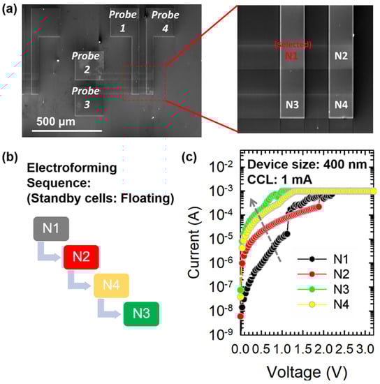 (a) SEM image (top view) of the 2 × 2 crossbar array and voltage is applied on the N1 cell, (b) electroforming sequence of N1, N2, N4, N3, (c) I-V characteristics of HfOx (6 nm) single-layer device in the forming sequence of N1 → N2 → N4 → N3 (size: 400 nm × 400 nm, CCL of 1 mA).