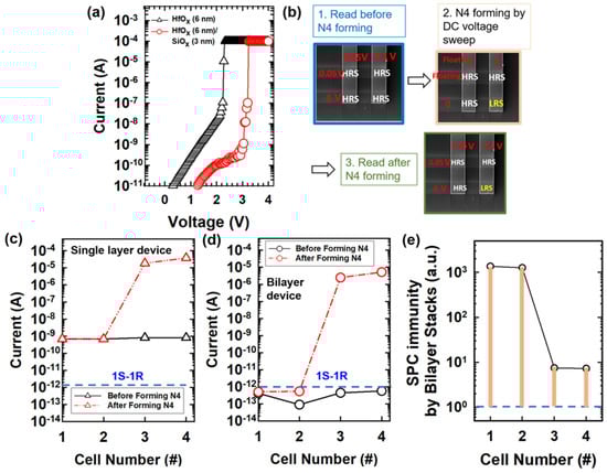 (a) Electroforming of HfOx (6 nm)(black curve) and HfOx (6 nm)/SiOx (3 nm) (red curve) devices i.e. N4 cell, (b) the design flow of experiments,(c,d) read current of HfOx (6 nm) on standby cells before (black curve) and after N4 electroformation (red curve), (e) SPC immunity improvement by using bilayer stacked structure.