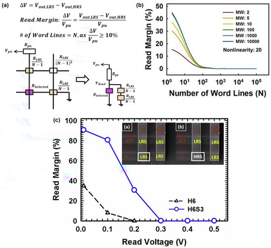 The read margin degrades with increasing read voltages, which depicts that the sneak path currents issue in the array is worse when the read voltages increased (Figure 4c). The pull-up resistor is used for the voltage drop measurement to calculate the read margin by definition [38]. The read margin is defined as the voltage drop (ΔV) divided by the pull-up voltage applied externally, where the sneak path current caused the voltage drop when the selected cell is at a low resistance state (LRS) i.e less resistive and higher SPC. Noted the resistance of the pull-up resistor is chosen as the LRS on the cell (~5 MΩ). The read margin decreases with increasing read voltage is due to the increment of voltage drop when the cell in HRS (i.e. VHRS). In other words, the sneak path current generated during the reading leads to higher VHRS, and lower read margin. The SPC immunity and the number of possible word lines in the array are higher in high-k/low-k stacked structures (i.e. H6S3) than a single high-k layer (i.e. H6). The self-rectifying effect of the bilayer device mitigates the read margin degradation owing to the built-in nonlinear nature which suppresses the sneak path currents. The mechanism was investigated on built-in nonlinearity in bilayer selectorless RRAM (patterned single device) comprehensively, including electrical modulations, switching gap of filamentary structure, and current transport mechanism by numerical analysis [39]. The dielectric non-uniformity and switching gap location in bilayer structures need to be well-designed to implement the built-in nonlinearity and perform the SPC immunity on the RRAM selectorless crossbar array. Leveraging the dielectric behaviors on selectorless bilayer RRAM, the reduced read currently on unselected cell (~0.01× of conventional RRAM) which is utilized as the “sneak path current block” in the future high-density array applications [39,40].