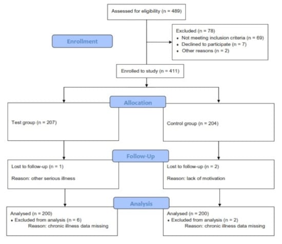 As shown in the study flow diagram (Figure 1), we invited 498 patients to participate. 69 did not meet the inclusion criteria, 7 declined, and 2 were declined due to cognitive impairment and the inability to maintain follow up needed. In the study, we divided 411 participants into two groups: 207 in the test group and 204 in the control group; 3 were lost in the follow-up process because of lack of motivation and other serious illness. A total of 408 patients and their 32 family physicians were enrolled in the analysis, but complete data were obtained from only 400 patients and their 30 family physicians, which were included in our analysis. Data on patients’ chronic illness or therapy were missing for eight patients, and two physician questionnaires were not submitted.