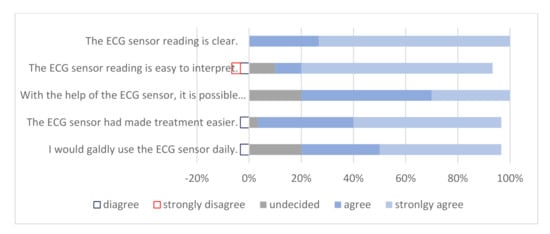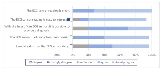 Finally, consumer and healthcare provider satisfaction also play a significant role in the treatment of the patient. Various studies have been conducted in this area, which have shown moderate satisfaction levels of both physicians and patients using telemedicine devices [40]. A study in Australia compared the usage of an ECG sensor with a standard Holter monitor [23]. Patients had to complete a questionnaire on the usefulness and ease of handling of the sensor. Of 47 patients, 21 previously had a Holter scan and responded that the sensor is more convenient (89.3%) and easier to use (90.5%). In our study, 82–98% of patients reported that the installation and use of an ECG sensor were easy, they were not bothered by the ECG sensor, and they gladly wore it and had no problems in its use. In similar studies, physicians were asked to complete a questionnaire about their satisfaction with this different telecardiology device [41,42]. The vast majority were extremely satisfied, and patient treatment was faster and more effective.