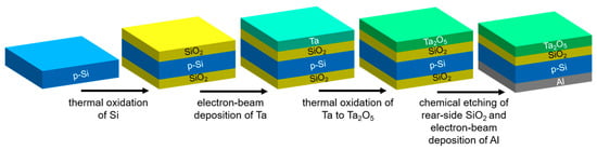The EIS sensor represents a bio/chemically-sensitive field-effect capacitor. The EIS chips consisting of an Al-p-Si-SiO2-Ta2O5 structure were fabricated from a ca. 380 µm thick Si wafer, with <100> orientation and 1–5 Ωcm specific resistivity. The fabrication process steps of the EIS chips are sketched in Figure 1. In its simplest embodiment, no photolithographic process steps are required. A thermally grown 30 nm thick high-quality SiO2 layer was formed by oxidation of the p-Si in a dry oxygen atmosphere at 1000 °C for about 30 min. This SiO2 layer guarantees the stable interface to the p-Si with low density of surface states. In the next step, a ~30 nm thick Ta film was deposited by electron-beam evaporation onto the SiO2 layer and oxidized in an oxygen atmosphere at 520 °C for 60 min, resulting in the formation of an approximately 60 nm thick Ta2O5 layer. The Ta2O5 serves as pH-sensitive transducer layer. The unwanted backside SiO2 layer, which is formed during the Si oxidation process, was removed by etching with hydrofluoric acid. Afterwards, an Al film (~300 nm thick) was deposited on the rear-side of the Si wafer by means of electron-beam evaporation to provide the electrical contact to the p-Si substrate, followed by tempering for 10 min in N2 atmosphere at 400 °C. Finally, the wafer was diced into 1 cm × 1 cm single chips. Before use, the chips were cleaned in an ultrasonic bath with acetone, isopropanol, ethanol and deionized water (each 5 min) and conditioned in buffer solution for at least 12 h.