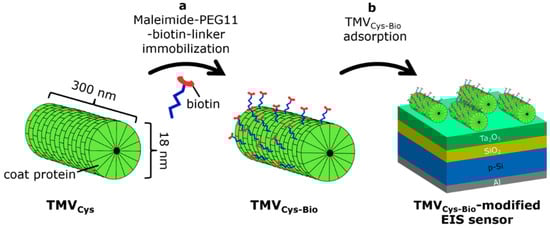 In order to utilize TMV particles as bioreceptor nanocarriers for biosensing applications, they should be functionalized with linker molecules enabling an efficient immobilization of receptor molecules. In this work, we used genetically modified TMV particles with a cysteine residue (TMVCys) at the amino terminus of each coat protein that provides a simple immobilization of bioreceptors via covalent binding of bifunctional biotin- and maleimide-terminated linkers to thiol groups of the cysteines, followed by affinity coupling of streptavidin-bioreceptor conjugates to the exposed biotin []. Figure 2 schematically illustrates the biotinylation procedure of TMVCys particles (a) and loading of biotinylated TMVCys-Bio particles onto the EIS sensor surface (b). The TMVCys particles, isolated from infected tobacco plants, were purified and biotinylated through covalent binding of bifunctional maleimide-polyethyleneglycol-biotin linkers (EZ-Link® Maleimide-PEG11-Biotin, ThermoScientific (Rockford, IL, USA)) to the thiol groups on the outer TMVCys surface. This results in TMVCys-Bio particles. The coupling efficiency of biotin linkers to the thiol groups on the outer TMVCys surface was determined densitometrically via image evaluation software ImageJ (Version 1.51k; Rasband, W.S., U.S. National Institutes of Health, Bethesda, Maryland, USA, https://imagej.nih.gov/ij/, 1997–2018) by using the procedure described in []. The large majority of accessible cysteine residues of TMVCys particles can be equipped with maleimide-polyethyleneglycol-biotin linkers, yielding an efficiency of biotinylation of approximately 94% and to about 2 × 103 corresponding biotin sites per TMVCys-Bio particle, available for a high-density immobilization of streptavidin-bioreceptor conjugates. These results are in good agreement with data reported in [,]. The biotinylated TMVCys-Bio particles with a concentration of 5 µg/µL were stored in a 10 mM sodium-potassium-phosphate buffer (SPP, 10 mM NaH2PO4 and 10 mM K2HPO4), pH 7, at 4 °C. TMVCys-Bio solutions with different concentrations were prepared from the TMV stock solution of 5 µg/µL by dilution with 100 mM SPP buffer (pH 7, ionic strength 150 mM). For the details of TMV isolation, purification and biotinylation procedures, see [,]. To load the TMVCys-Bio particles on the EIS sensor surface, the Ta2O5-gate surface was incubated with the respective TMV solution.
