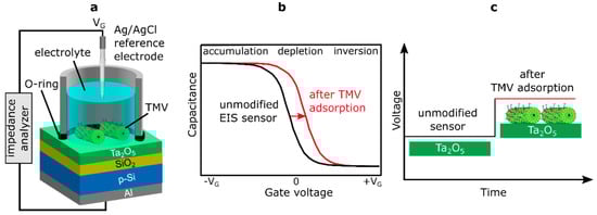 For the characterization of EIS sensors, two basic operation modes are typically used: the capacitance-voltage (C–V) and the constant-capacitance (ConCap) mode [,]. Figure 3 shows the measurement setup of a TMV-modified EIS sensor chip (a), the high-frequency C–V curve for a p-type EIS sensor with the characteristic regions of accumulation, depletion and inversion (b), and the ConCap response (c) of a bare (unmodified) EIS sensor and an EIS sensor after TMV adsorption.