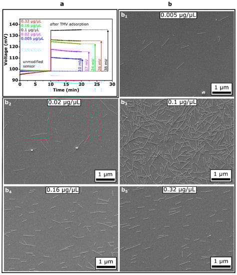 The results of the label-free detection of the adsorption of TMVCys-Bio particles with the capacitive field-effect sensors were supported by SEM surface characterization of the same sensor chips. Examples of SEM images of the sensor surfaces covered with TMVCys-Bio particles loaded from TMV solutions of different concentrations are presented in Figure 4b (b1–b5). In the SEM images, randomly oriented, laterally assembled single TMV particles with typical lengths of 300 nm, incomplete or partially disaggregated/broken short fragments of about 50–200 nm length as well as the formation of end-to-end aggregated long particles are clearly visible. The TMVCys-Bio particles did not form ordered structures on the Ta2O5 surface. A similar effect has been observed upon TMV adsorption, for instance, on bare [] and oxidized [] Si substrates, Pt electrodes [] and Au-covered Si [], and can be explained by the lack of the adsorbed particles’ mobility. When adsorption occurs, the respective TMV particles become “frozen” in position and orientation, resulting in randomly distributed particles with a large inter-particle spacing [].