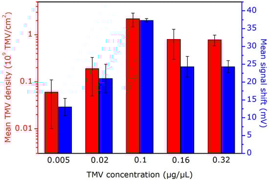 The mean surface density of TMVCys-Bio particles as a function of virus particle concentration in solution, evaluated from several SEM images for three prepared sensors, is shown in the bar chart diagram in Figure 5. Here, the mean amplitudes of ConCap signal changes for each three sensors as a function of TMVCys-Bio particle concentration are also presented. With increasing concentration of TMVCys-Bio solution from 0.005 to 0.1 µg/µL, the mean density of loaded virus particles on the Ta2O5 surface is increased from approximately 0.06 × 109 to 2.2 × 109 TMV/cm2. A similar trend in the amount or surface density of adsorbed TMV particles as a function of virus concentration in solution was observed upon loading of TMVCys-Bio particles on Pt electrodes [] and TMVCys particles on a gold-covered Si wafer [,]. In addition, Bäcker et al. reported on saturation of the surface coverage of TMV particles on Pt electrodes by elevated virus concentration []. However, in our experiments, surprisingly, a further increase of virus concentration in the loading solution to 0.16 and 0.32 µg/µL resulted in a lowered density of TMVCys-Bio particles on the Ta2O5 surface of 0.8 × 109 TMV/cm2 and 0.78 × 109 TMV/cm2, respectively.