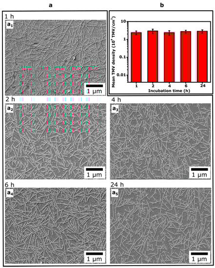 (a) SEM images taken from Ta2O5 surfaces after incubation of EIS chips with 0.1 µg/µL TMV solution for 1 h, 2 h, 4 h, 6 h, and 24 h (a1–a5); (b) Mean density of TMV particles on Ta2O5 surfaces evaluated from SEM images. For each incubation time, three EIS chips were characterized (n = 3).