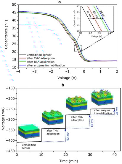 The ConCap signal of the same EIS sensor measured at a constant capacitance value of 22 nF is depicted in Figure 7b. The working point for the ConCap measurements was chosen from the depletion region of the C−V curves in Figure 7a. As can be seen, immediately after exposing the EIS sensor surface to the measurement solution, signal changes of about 63 mV, 66 mV and 28 mV were recorded after modification of the Ta2O5-gate EIS sensor surface with TMVCys-Bio particles, BSA blocking agents and enzyme immobilization onto the TMV surface, respectively. These signal changes correlate very well with the shifts of C−V curves along the voltage axis in Figure 7a.