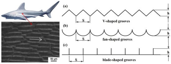 After decades of continuous exploration, the surface drag reduction technology using bionic surface microstructure has been applied in many fields. Choi et al. [] studied the hydrodynamic mechanism of drag reduction with V-shaped grooves with numerical simulation methods, and Figure 1 shows three kinds of micro-groove models. Lee [] focused on the wall flow state of a turbulent boundary layer in a semicircular groove, and Samni et al. [] also simulated the blade-shaped groove surface against a low Reynolds number turbulent groove. From these results, it was found that the drag reduction rate of the trench could reach a maximum of 11% when the trench height and clearance ratio is around 0.5. In the research work on the fan-shaped grooves with different h/s, Bechert et al. [] observed that the best rate of drag reduction approximates to 6.5% when the scale of h/s is 0.7.