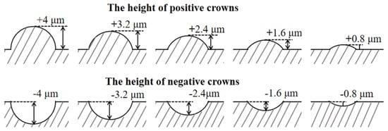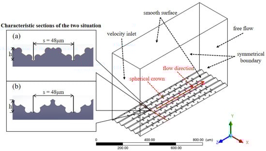 The dimensions of the V-shaped groove used in this paper were measured by other researchers []. Based on these measurements, an averaging process was conducted. In the following of this paper, the depth “h” of a special V-shaped groove is 16μm, and the width “s” of a special V-shaped groove is 48 μm. To avoid overly damaging basic V-shaped groove from the spherical crown, the radius of the spherical crown on the surface of the special V-shaped groove is set to be 4 μm in this paper. Bechert et al. [] discovered staggered three-dimensional blade grooves could be a better function of drag reduction. In this paper, the layout of spherical crowns on the surface of V-shaped grooves is considered in modeling the special groove structure. The model of spherical crowns with a radius of 4 μm are staggered and uniformly distributed on the surface of special V-shaped grooves at a pitch of 30 μm. The height of the complete crown is defined as r, and the r is 4 μm. A series of special V-shaped grooves are formed by changing the height of spherical crowns, and Figure 2 shows ten different heights of crowns on the surface of special V-shaped grooves. Each height of the crown constitutes a three-dimensional spherical crown microstructure. When modeling, those bulge-like spherical crowns with positive protrusion height are set to be positive, and the concavity like spherical crowns with negative protrusion height is set to be negative at the same time.