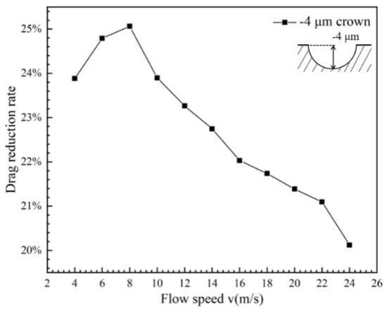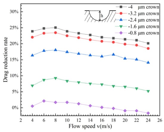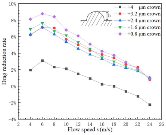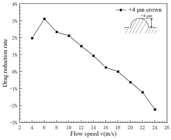 The drag reduction rate of the traditional V-shaped groove model from the shark skin surface is generally about 6.5%, which is undesirability. Based on this, the two-dimensional V-shaped groove structure is partially modified in this model, which distributes positive spherical crowns of different heights on the surface of the V-shaped groove. For the spherical crown structure of the V-shaped groove surface, when the protruding direction of the spherical crown is positive, the curve of the drag reduction rate with the flow speed is shown in Figure 4. From this curve, the characteristic of drag reduction is a very obvious correlation with the water flow velocity on the surface of a positive spherical crown structure. For a V-shaped groove structure with a positive crown microstructure, it has some small drag reduction effects in low flow speed. However, from the curve of Figure 4, it can be observed that a V-shaped groove structure with positive crown microstructure behaves counteraction for flowing liquid with a high speed, in this case, those positive crowns produce and increase the resistance of flowing liquid.