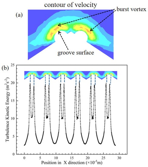 The drag reduction potential of the groove is determined by the effective penetration height of the crowns on the surface []. Figure 5 shows the situation with a complete crown. Figure 5a is a contour of velocity near the groove surface. In this contour, it can see that there are the same burst vortexes on the top of the crown. Figure 5b iconifies the turbulent kinetic energy on the groove surface, it can be seen that the position of large peaks coincides with the position of triangular groove, and the two small tips on each large peak coincide with the position of two protruding spherical crowns on the surface of V-shaped groove structure. From the contour of velocity and curve of turbulent kinetic energy near the groove surface, it can be determined that those positive spherical crowns cause a burst of flow vortexes, which result in a large number of secondary vortexes. These vortexes increase the interaction between the fluid and the surface of the wall, which induces an increase in the frictional resistance of the wall surface.