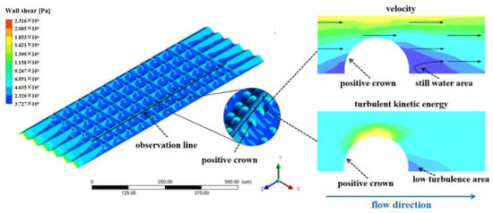 In addition, due to the blocking effect of the spherical crown on the water flow, there is a still water area within a certain range behind the crown, which shows in Figure 6 and Figure 7, the flow velocity in this still water area decreases sharply, and the surface shear stress also decreases accordingly. Because of the low turbulent kinetic energy, it can be judged that the turbulent motion of water stabilizes than another place. In this area, the frictional resistance plays a key role, and the wall shear stress here is obviously reduced, which decreases frictional resistance.