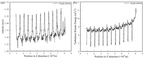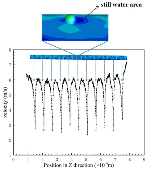 In order to investigate the drag reduction effect of the negative spherical crown on the groove surface, an observation line which the position as same as Figure 11 is set along the direction of the water flow, and it is used to observe various parameters of the water flow after passing through the negative spherical crown. The way negative spherical crowns affect the flow vortexes near the surface is very different from the traditional V-shaped groove surface. The intensity of turbulent kinetic energy and water flow velocity is observed by the observation line. It can be clear that vortexes play an important part in the drag reduction effect. Figure 11 shows the vortex at the location of the negative crown microstructure on the V-shaped groove surface. When the water with some speed flows through the negative spherical crown, vortexes form in the spherical crown. A part of the water flows through vortexes and reflows with the main fluid. When two parts of the fluid combine to a flow velocity peak, which shows in Figure 12a, the turbulent kinetic energy can also be used to comprehend the state of flowing water on the surface of the negative crown microstructure. Figure 12b translates the relationship between turbulent kinetic energy with the flow direction. Combining Figure 11 and Figure 12, in the position of the negative spherical crown, the flow velocity roses sharply and the turbulent kinetic energy has a sharp decline. The sharply decreasing turbulent flow energy shows the water flow near the negative spherical crown has been converted from turbulent to laminar. This mechanism plays a crucial role in the drag reduction effect of negative crown microstructure.