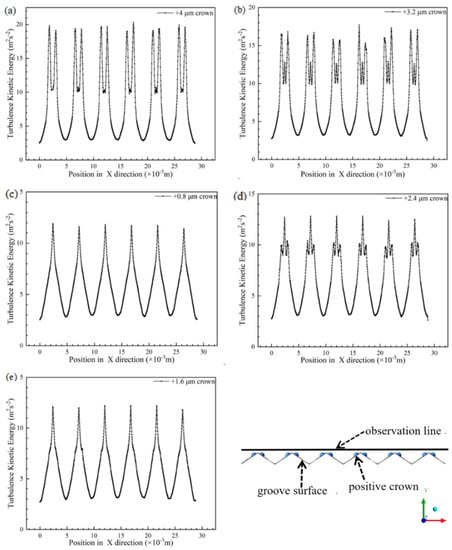 The turbulent kinetic energy which perpendicular to flow direction. From (a–e), the height of the positive spherical crown changes from +4 μm to +0.8 μm.