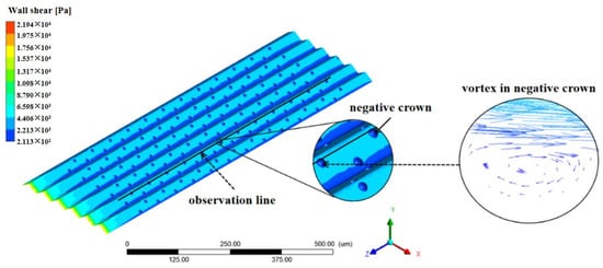 The wall sheer stress of negative crown microstructure at 12 m/s, and the vortex in negative crown.