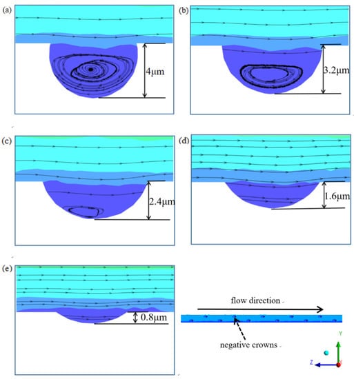 From (a–e) the longitudinal height of the negative crown is arranged in order from deep to shallow. It can be seen that as the longitudinal height decreases, the size of vortexes in the crown gradually decreases. Surface drag reduction.