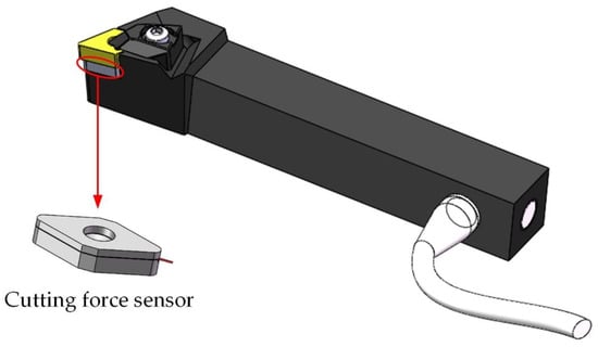 The overall structure of the embedded high-sensitivity cutting force measurement device researched in this paper included the cutting force sensor and the smart tool, as shown in Figure 1. The cutting force sensor was inserted into the smart tool instead of the tool pad. Then the tool was capable of simultaneously cutting and measuring cutting forces without changing the shape of the tool, which makes the tool have good compatibility and versatility with the machine tool system.