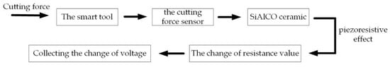 The working principle of cutting force measurement is shown in Figure 2. During the cutting process, the cutting force F is applied to the tool and then transmitted to the cutting force sensor. Because the sensitive material SiAlCO ceramic of the cutting force sensor has the piezoresistive effect, the resistance value of the SiAlCO ceramic will change with the cutting force F. Then, the voltage of SiAlCO ceramics will change. The change of voltage is collected by the data acquisition card. Then, after the signal is transmitted and processed, the cutting force F will be displayed and stored on the computer.
