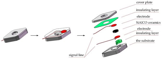 After the SiAlCO ceramic was manufactured, the next step is to package the cutting force sensor so that the sensor can be used for actual cutting force measurement. The actual application environment of the cutting force sensor was more complicated, including the corrosion of the cutting fluid, the vibration of the machine tool system, the impact of high-temperature chips, and the processing noise, etc. These interferences will adversely affect the dynamic and static performance, reliability, and long-term stability of the cutting force sensor in actual use. These adverse effects need to be reduced or eliminated through the packaging of the cutting force sensor. According to the complex actual application environment of the cutting force sensor, the packaging principles of the sensor were designed as follows: (1) after packaging, the sensor should realize the connection of the sensitive resistor and the measuring circuit and the corrosion resistance, high-temperature resistance and insulation protection of the sensitive resistor; (2) the cover plate is rigidly connected with the substrate into one body, so that the packaged sensor and the tool pad are consistent in overall shape and size and isolate the sensor from the outside.