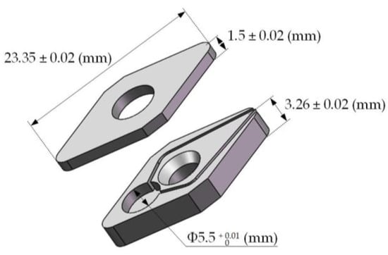 As shown in Figure 3, the cutting force sensor developed in this paper mainly included a substrate, a cover plate, and a sensitive unit. The sensitive unit mainly included: a sensitive resistor, two electrodes, signal lines, and insulating layers. The structural design mainly was divided into three parts: the substrate and cover plate, sensitive unit, and the smart tool. The material selected for the substrate and the cover plate was 304 stainless steel. The mechanical properties of 304 stainless steel were very similar to those of the original shim material, and it was easier to process and cheaper. The specific dimensions of the substrate are shown in the Figure 4, and the external dimensions were the same as the original tool pad. The sum of the thickness of the substrate and the cover plate was the same as that of the original tool pad. The sensitive unit of the sensor adopts a sandwich structure and consisted of two electrodes and a SiAlCO ceramic wafer in the middle. The electrodes and the ceramic wafer were a round shape of Φ5.5 mm. The electrodes and the ceramic wafer were bonded with conductive silver paste.