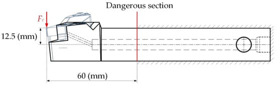 In order to check whether the cutting tool embedded with the cutting force sensor can work safely in actual cutting, it was necessary to conduct a safety check on the tool. According to the actual cutting condition of the tool, the situation when the tool is under force was established, as shown in the Figure 6. Under the action of the main cutting force Fc, the dangerous section of the tool was as shown in the Figure 6. The dangerous section of the tool was at the end of the gripper. The horizontal distance between the force point and the dangerous section was 60 mm; the distance between the force point and the neutral axis of the section was 12.5 mm. The tool material was 42CrMo alloy structural steel. The bending stress and shear stress at any point in the cantilever beam structure can be obtained by Equations (2) and (3). The third strength theory [] was selected for strength check, and the check formula is shown in Equation (4).