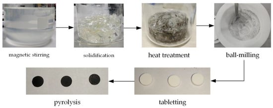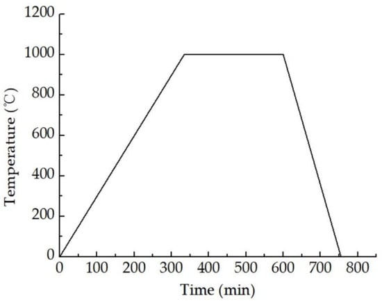 The production of SiAlCO ceramics used aluminum sec-butoxide and silicone resin as raw materials and was synthesized through pyrolysis. The silicone resin used belongs to a high-carbon polysiloxane containing phenyl groups, and aluminum sec-butoxide was the source of aluminum. The production steps of SiAlCO ceramics is shown in Figure 7, and the details are as follows: (1) mixing the silicone resin with ethanol at a mass ratio of 2:1, then adding 5% by mass of ATB; (2) stirring the mixture at room temperature at 800 rpm for 6 h to obtain SiAlCO precursor solution; (3) solidifying the SiAlCO precursor solution at 150 °C and heat-treating the solids in ultra-high purity argon at 350 °C for 4 h; (4) ball-milling the solids to obtain a granular powder less than 1 μm; (5) mixing the powder with the SiAlCO precursor solution in a volume ratio of 40:1 and compressing the powder mixture into a Φ5.5-mm wafer, then compacting the wafer by a cold isostatic press; (6) pyrolyzing at 1100 °C under ultra-high purity argon gas following the pyrolysis temperature curve shown in Figure 8 to obtain the SiAlCO ceramics [].