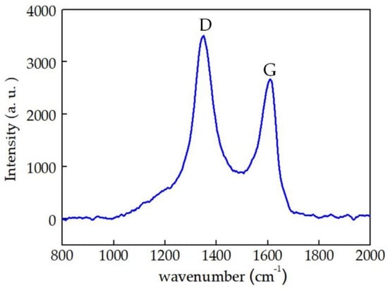Free carbon is an important factor in piezoresistive effect of SiAlCO ceramics. After obtaining the SiAlCO ceramic samples, we analyzed whether the samples contained free carbon or not. The test was carried out by Raman spectrometer. As shown in the Figure 9, the Raman spectrum contains D peak and G peak, which are characteristic peaks of carbon atoms. SiAlCO ceramics had obvious characteristic peaks around 1350 cm−1 and 1600 cm−1, corresponding to peak D and peak G, respectively. The appearance of peak D was caused by the breathing vibration mode of sp2 hybridized ring carbon atoms. Peak G was caused by the stretching vibration mode of sp2 hybrid carbon atoms in the plane []. All samples had D peak and G peak, which proved the existence of free carbon in the samples.