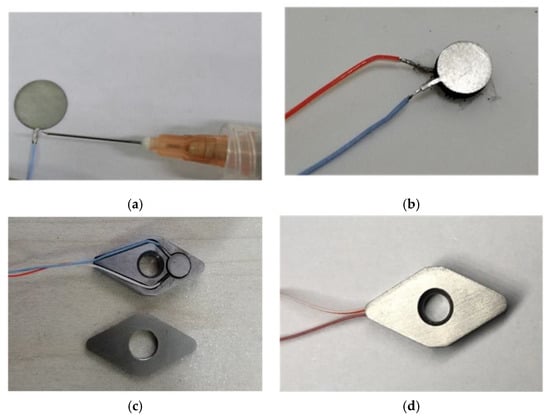 The packaging steps of the sensor are shown in Figure 10: (a) The wires and electrodes are connected by conductive silver paste; (b) the electrodes are in close contact with the surface of the SiAlCO ceramic through the silver paste; (c) the insulating paint is sprayed on the surface of the cover plate and the substrate as an insulating layer; (d) the SiAlCO ceramic with the electrodes are put into the groove of the substrate, and then the cover plate is welded to the substrate using laser welding. The cutting force sensor packaged is shown in Figure 10d. In the following research, the performance of the sensor will be tested.