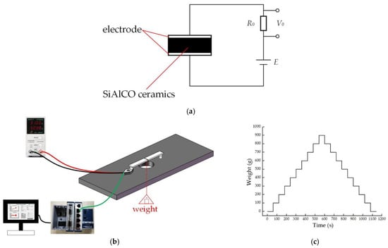 Figure 11a is the schematic diagram of the circuit set up for the experiment. The sensor was connected to the outside circuit by two signal lines. The two signal lines were connected with the fixed value resistor R0 and the power supply E. As shown in Figure 10b, the force F was generated by loading weights. When force F was applied to the sensor, it transferred to the SiAlCO ceramic. Due to the piezoresistive effect, the resistance value of SiAlCO ceramics changed, resulting in a change in the voltage value of the fixed value resistor R0. The performance of the sensor can be obtained by measuring the voltage value of the fixed value resistor R0. The data acquisition system was used to collect the voltage of the fixed value resistance.