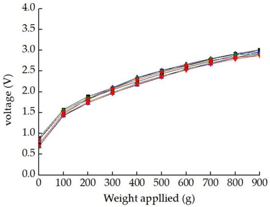 As shown in Figure 11b, the performance test of the sensor was carried out on the self-built force sensor calibration platform. The testing device mainly included the calibration platform, weights, the weight plate, the beam, power supply, the data acquisition system, and a computer. The power supply voltage was 5 V. The specific test steps were as follows: (1) connecting the circuit according to the circuit schematic shown in Figure 11a; (2) placing the beam according to Figure 11b, with one end of the beam on the sensor; (3) adjusting the weight plate position so that it is in the middle of the beam; (4) turning on the power supply and adding the weights to the weight plate one by one. The weight increased from 0 to 900 g, each time increasing by 100 g. Each weight was maintained for 60 s, as shown in the Figure 11c. At the same time, the data acquisition system collected the voltage output by the sensor; (5) removing the weights from the weight plate one by one. The weight of the weight was reduced from 900 to 0 g, each time by 100 g; (6) repeating the steps (4) and (5) several times.