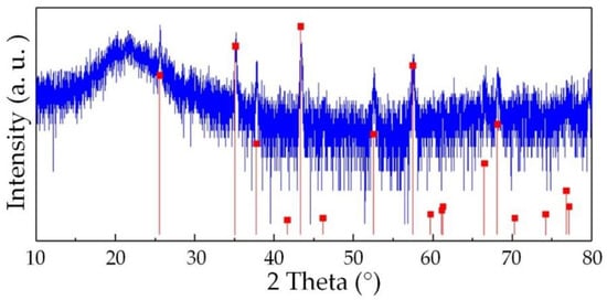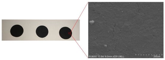 In order to research the reason for the poor repeatability of the sensor, the SiAlCO ceramic samples were analyzed by a scanning electron microscope (SEM, SU8010, Hitachi, Japan) and x-ray diffractometer (XRD, D8 ADVANCE A25, Bruker, Germany). SEM was used to observe the surface morphology of the SiAlCO ceramic sample. As shown in the Figure 13, small gullies and holes on the surface of SiAlCO ceramics were observed in the SEM picture. It can be known that the SiAlCO ceramic samples produced had low density. This led to poor sensor repeatability. Figure 14 is the XRD pattern of the SiAlCO ceramic sample. The red lines in the spectrum are the possible diffraction peaks of Al2O3 crystals []. From the XRD pattern, eight peaks of Al2O3 crystals coincided with the diffraction peaks that appear in the X-ray diffractometer spectrum of the SiAlCO ceramic measured. It indicates that Al2O3 crystals appeared in the prepared SiAlCO ceramics. The Al2O3 crystal will affect the conductivity of the sample, resulting in poor sensor repeatability. Therefore, the quality of SiAlCO ceramics will be improved from two aspects in subsequent research. The first measure is to improve the quality of the tabletting, including the use of smaller particle size powder and higher pressure. The second measure is to improve the process to prevent the sample from contacting oxygen during the heat treatment process.