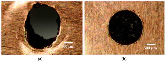 Images from optical microscope: (a) Through hole (Ip = 5 A, Ton = 100 µs, Toff = 300 µs); (b) Blind hole (Ip = 1 A, Ton = 200 µs, Toff = 250 µs).