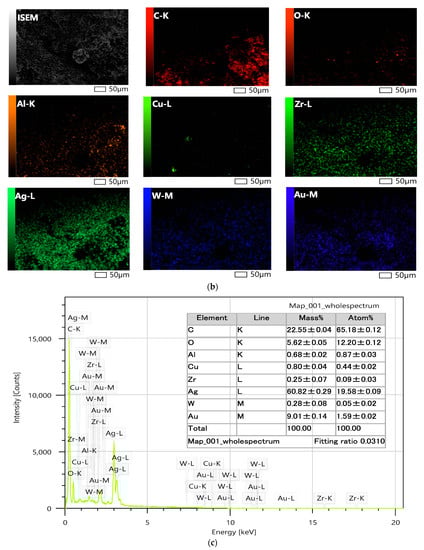 As the EDM of non-conductive ceramics is made possible by the assistive electrode method, the material removal mechanism is somewhat different than the traditional EDM of conductive metals. Surface modification and the migration of material play major roles in progression of machining during the EDM of non-conductive ceramics. The main challenge is the formation of electrically conductive layers where sparking can continue to occur. The sparking starts with the conductive coating in the assistive layer, and then continues on the machined surface due to surface modification and migration of electrically conductive materials from the coating and tool to the workpiece. As can be seen from EDS mapping of the machined surface (bottom of hole) presented in Figure 3 carbon, oxygen, and tungsten migrated to the machined surface. The presence of copper and silver indicates the migration of electrically conductive materials from the assistive electrode. Carbon constitutes a huge portion of materials that were deposited on the machined surface. It comes from two sources, primarily from the carbon nanofibers that was applied as a conductive layer and secondarily from the decomposition of dielectric. The presence of oxygen is due to oxidation and copper and silver come from the conductive layer that was applied on top of ceramics. Aluminum and zirconia originate from the ceramics itself. The migration of tool particles on the surface of ceramics can be observed due to the presence of tungsten. Also, gold can be seen from the elemental analysis table on EDS spectrum, which was applied on the machined surface to make the ZTA ceramic surface electrically conductive for taking SEM images.