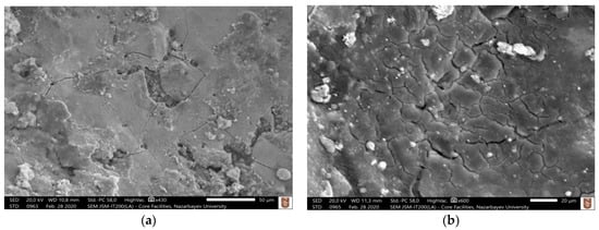 As a result of the migration of materials and due to high temperature generated during machining, it was hypothesized that conductive metal carbides are formed on the machined surface, which cracks and peels off the machined surface due to the continuous sparking and thus facilitates the material removal. It is reported in the literature that the material removal mechanism of ceramics machined by assistive electrode method can be characterized by five distinguished phenomena, melting and evaporation, thermal spalling, decomposition and oxidation, fusion and vaporization, and electromagnetic and electrostatic force []. In this study, some of these characteristics were observed. The migration of material discussed in the previous section is an indicative of the decomposition and oxidation mechanism. The most common mechanism of material removal observed during the EDM of non-conductive ZTA using assistive electrode method in this study was thermal spalling. Thermal spalling, typically seen in the refractory materials, includes breaking, cracking, and then finally peeling off layers due to high temperature. Due to the higher temperature (above 8000 °C) involved in the EDM process, thermal spalling is considered as one of the associated material removal mechanism where grain/s of material is peeled off from a large body. This occurs as a result of thermal impact due to the higher EDM process temperature and leads to ultimate mechanical breakdown. During the process, thermal gradient induces internal stress, which in turn causes the initiation and propagation of micro-cracks. Consequently, tension or shear failure occurs due to increased thermal extension force. In case of ceramics materials, spalling may cause the detachment of both single and multiples grains. Intergranular cracks and/or transgranular crack contribute towards the materials removal. Higher stress contact point is favored for thermal spalling []. For almost all cases of machined blind holes at different combinations of machining parameters, cracks were observed on the machined surface. Figure 4 shows examples of machined surfaces with thermal cracks on the surface. Table 5 presents the measurements of lengths of three to five micro-cracks on the machined surfaces shown in Figure 4. It can be seen that the average length of micro-cracks increases with the increase of pulse on time and pulse off time. It is also found that the cracks are interconnected, which facilitate the material removal during the thermal spalling process. Thermal cracking is the first step of the thermal spalling process, which leads to eventual peeling off of the layers or materials from the ceramic surface. Thermal spalling leads to a very rough and irregular surface of the machined ceramic, as can be seen from examples provided in Figure 5. It is important to note that thermal spalling on machined ceramic surface exhibits much rougher and irregular surface than traditional EDM, thus distinguishing thermal spalling process of material removal mechanism compared to typical EDM machined surface. The random deposition of molten debris on the machined surface found in all the images indicates the melting and evaporation mechanism of material removal, which is an obvious material removal mechanism for any EDM process. The step-by-step mechanism of material removal during the EDM of electrically non-conductive ceramics (zirconia toughened alumina (ZTA) for this study) is presented in Figure 6.
