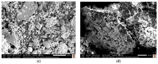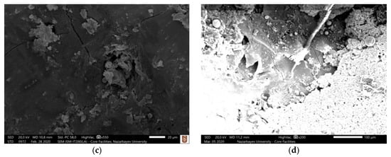 Example of thermal spalling on the machined surface at different experimental conditions, (a) Exp 2 (80 V, 1 A, Ton = 100 µs, Toff = 250 µs.), (b) Exp 7 (80 V, 1 A, Ton = 200 µs, Toff = 200 µs.), (c) Exp 9 (80 V, 1 A, Ton = 200 µs, Toff = 300 µs.), (d) Exp 20 (80 V, 3 A, Ton = 100 µs, Toff = 250 µs.).