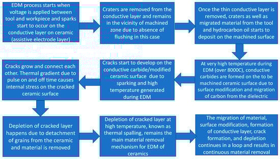 Step-by-step material removal mechanism during EDM of electrically non-conductive ceramic.