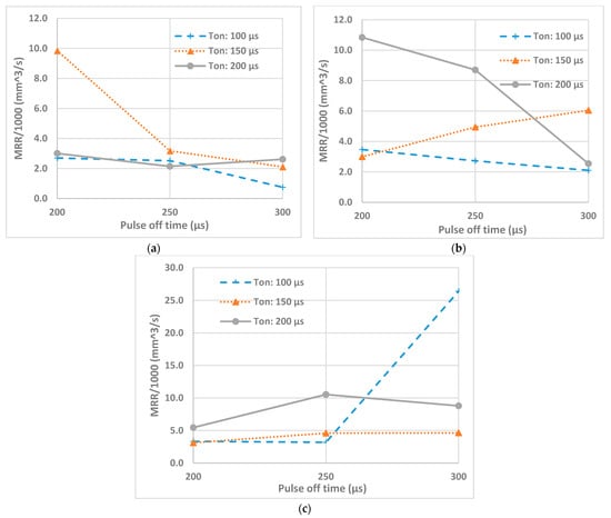 Figure 7 shows the effects of pulse on time and pulse off time at different peak currents on the MRR. As it can be seen from Figure 7, for machining at 1 A peak current, increasing the pulse off time at pulse on time of 150 µs leads to a rapid decrease of MRR. For the machining at 3 A, rapid decrease of MRR can be observed at pulse on time of 200 µs. Except for a few occasions, the MRR decreased with the increase of pulse off time or pulse interval. This is due to the fact that with the increase of pulse interval the duty ratio decreases, i.e., the percent of time the current is passing through is reduced, which results in lower amount of material removal per unit of time. Although higher settings of the pulse off time decreases MRR, there need to be an optimal setting of pulse off time in order to ensure stable machining operation by reducing number of arcing and short-circuiting pulses [].