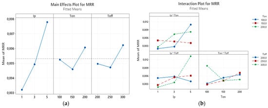 Figure 8b shows the interaction effect plot for the MRR. During the interaction plot, parallel lines indicate no significant interaction, whereas non-parallel lines indicate the existence of interaction between the parameters. From the interaction plot it can be observed that the interaction effects are present for different combination of peak current, pulse on time, and pulse off time on the MRR. The most significant interaction effect for MRR among these three is between peak current and pulse off time. It can be observed that the interaction effects between peak current and pulse on time and the interaction effect between pulse off time and peak current are minimal. Generally, the MRR increases with combined increase of peak current and pulse on time. The MRR was also increased with the increase of peak current, as with the increase of peak current the discharge energy per pulse increases resulting in larger crater (unit volume of material removed per pulse) [].