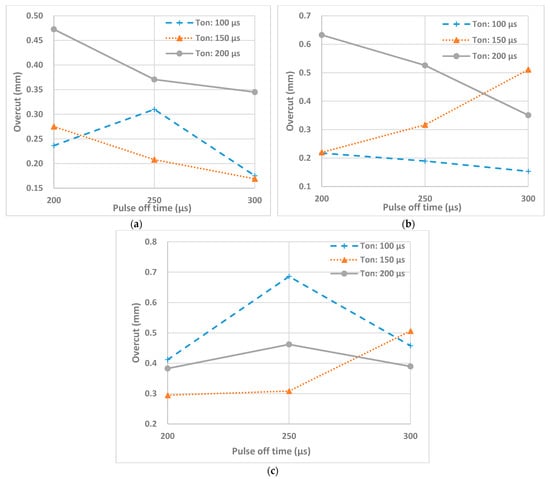 Effects of Ton and Toff on overcut at peak currents (a) 1 A, (b) 3 A, (c) 5 A.