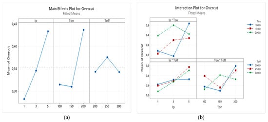 The interaction effects and main effects of process parameters of EDM of nonconductive ATZ on overcut were studied by conducting variance analysis by plotting these effects. In the Figure 10a the main effect plot for the overcut can be observed. For each parameter level, the means of overcut can be seen on this plot. Based on this plot, increasing the peak current raised the overcut. The increase in current resulted in the increase of MRR which in turn resulted in the increase of overcut. The effect of pulse on time on the overcut is not significant until 150 µs but is found to increase at 200 µs. The overcut increased slightly then decreased with the increase of pulse interval, as can be seen from Figure 10a.