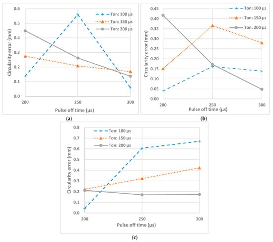 In this study, the circularity error of machined holes was measured in terms of maximum variation of diameter, i.e., distance between the highest and lowest point at the rim of hole. Figure 11 shows effects of pulse on time and pulse off time at different peak currents on the circularity of machined holes. It can be observed that at higher peak currents circularity error increases, due to higher discharge energy which leads to larger crater sizes. The larger the crater sizes the rougher is the hole edge and the higher is the variation between the maximum and minimum point at the hole profile. However, the higher pulse on time and pulse off time help to decrease circularity error as it can be seen in case of 3 A and pulse on time of 200 µs and pulse off time of 300 µs and in case of 5 A and pulse on time of 200 µs and pulse off time of 300 µs. This is mainly due to the improved machining stability at a combined settings of pulse duration and pulser interval. Higher peak currents allow for removing more material, however, too short of a pulse on and pulse off time will result in rough machining. This leads to an uneven radial surface that is the cause of high circularity error.