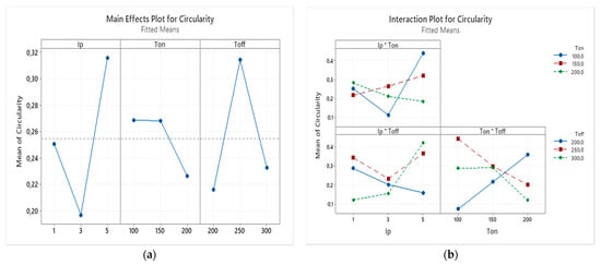 The interaction effects and main effects of process parameters of EDM of nonconductive ZTA on circularity were studied by conducting variance analysis by plotting these effects. In the Figure 12a, the main effect plot for the circularity error can be observed. For each parameter level, the means of circularity error can be seen on this plot. Based on this plot, increasing the peak current from 1 to 3 A, resulted in the decrease of the circularity, which is favorable, however, increasing it from 3 to 5 A resulted the increase of the circularity error which is expected since increase in current leads to increase of crater radius and decrease in uniformity of machining. The increase of pulse on time showed only a slight decrease of circularity error. Pulse off time increase shows first sharp increase and after reaching 250 µs shows sharp decrease. The main effect plots using variance analysis does not indicate specific trends on effect of parameters on the circularity error of the machined holes during EDM of non-conductive ZTA ceramics.