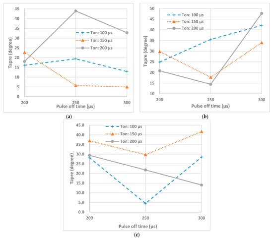 Effects of Ton and Toff on taper at peak currents (a) 1 A, (b) 3 A, (c) 5 A.
