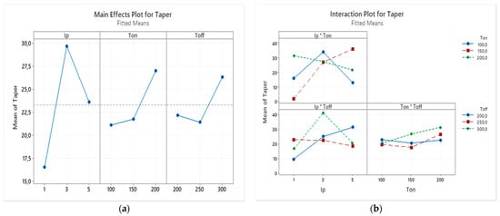 The interaction effects and main effects of process parameters of EDM of nonconductive ZTA on taper were studied by conducting variance analysis by plotting these effects. In the Figure 14a the main effect plot for the taper can be observed. For each parameter level, the means of taper can be seen on this plot. Based on this plot, increasing the peak current from 1 to 3 A results in a sharp increase, however, further increase leads to a reduction of taper. The trend for pulse on time and pulse off time is similar. The increase in those parameters lead to a slight increase of the taper.