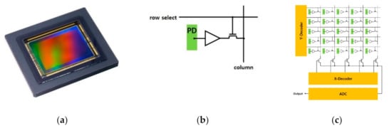 Complementary metal oxide semiconductor (CMOS) Image Sensor: (a) CMOS Sensor for industrial vision (Canon Inc., Tokyo, Japan); (b) Circuit of one pixel; (c) Pixel array and Analog Frontend (AFE).