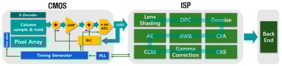 The ISP is a processing block that converts the raw digital image output from the AFE into an image that can be used for a given application. This processing is very complex and include a number of discrete processing blocks that can be arranged in a different order depending on the ISP [16]. ISP consists of Lens shading, Defective Pixel Correction (DPC), denoise, color filter array (CFA), auto white balance (AWB), auto exposure (AE), color correction matrix (CCM), Gamma correction, Chroma Resampler and so on as shown in Figure 2.