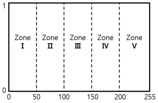 To look through the characteristics of the training image, we investigated the histogram of image each. As shown in Table 1 and Figure 5, we categorize them into some distribution types of brightness and contrast according to concentration of peak, pixel intensity etc. In order to obtain the appropriate threshold in actual image with various illumination, it is estimated as an important task. The number of peaks and intensities is considered in divided zone of histogram, as shown in Figure 5. The intensity of each zone is scored as Izone, while the peak of each zone is scored as Pzone, as follow,