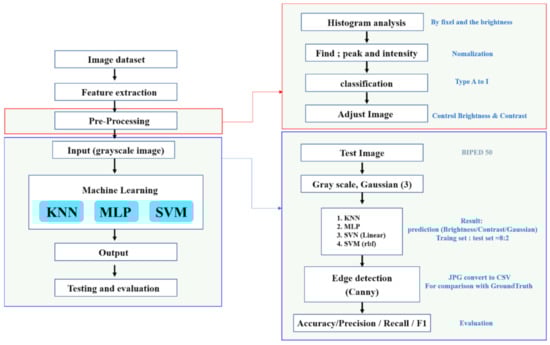 There are a variety of edge detection methods that are classified by different calculations and generates different error models. Prewitt, Canny, Sobel and Laplacian of Gaussian (LoG) are well-used operators of edge detection [7]. They are sensitive of noise so as to deal with the shortcomings, edge detection filters or soft computing approaches are introduced [8]. Computer vision technology can supplement deficiencies with machine learning. A lot of algorithms have been previously introduced to perform edge detection; gPb-UCM [9], CEDN [10], RCF [11], BDCN [12] and so on. As a part of these efforts, we propose pre-processing method to determine optimized contrast and brightness for edge detection with improved accuracy. We performed three types of machine learning models including MLP, SVM and KNN; all machine learning methods showed better F1 score than non-machine learned one, while pre-processing also scored better than non-treated one.